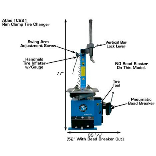 El Atlas TC 221 desmontadora es el cambiador perfecto para un pequeño comercio de llantas o un vehículo todo terreno / concesionario de motocicletas.